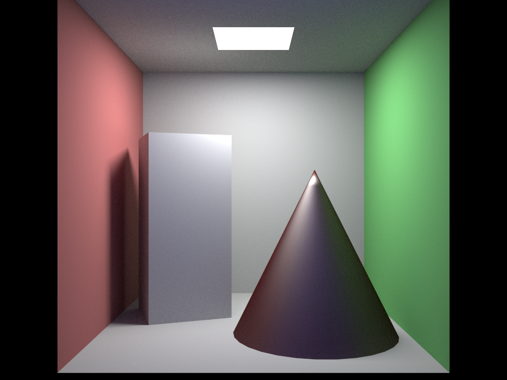 Below are two sample scenes rendered using the engine. The first demonstrates soft shadows, diffuse reflection, and color bleeding in a classic Cornell Box environment. The second showcases a reflective cone with complex light interactions and specular highlights.